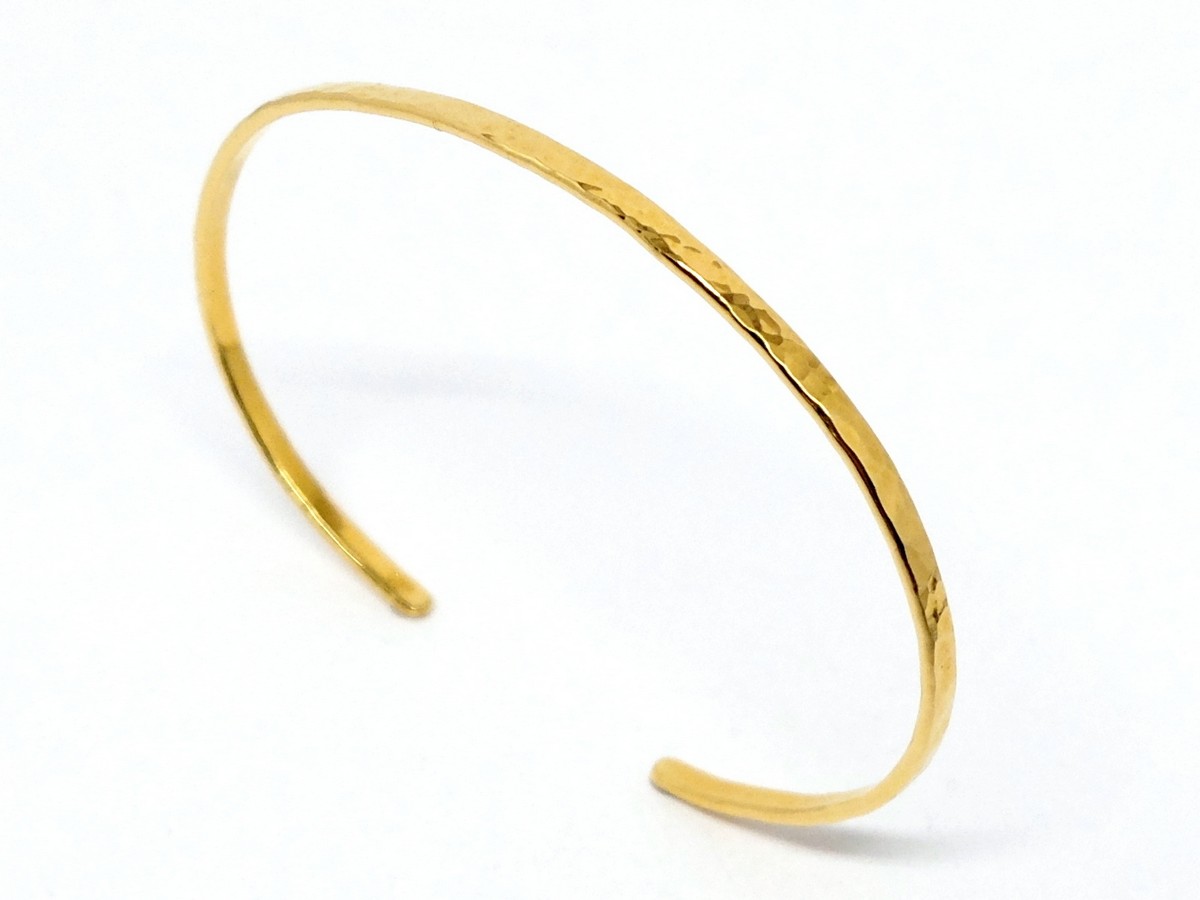 Armreifen: Durch die geschmiedete Oberfläche erhält jedes Stück seine individuelle Hammerschlag-Struktur – kein Armreif gleicht dem anderen. Sowohl in Silber als auch mit Feingold plattiert: durch die polierte Oberfläche wirkt die Struktur besonders schön und wirkt edel, ohne aufdringlich zu sein. Trotz seiner filigranen Optik sind die Armreifen stabil und lassen sich leicht öffnen und anlegen.